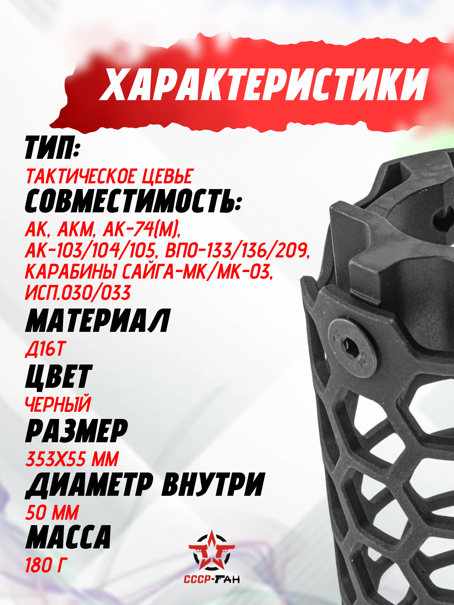 Цевье совместимо как с армейскими автоматами АК 5.45 и 7.62 мм, так и с их гражданскими вариациями в лице карабинов Вепрь и Сайга с соответствующими местами крепления. Если изделие ставится на укороченные модели по типу исп. 033, то его габарит может выпирать за пространство дульного среза - это нужно учесть при выборе дульного устройства.