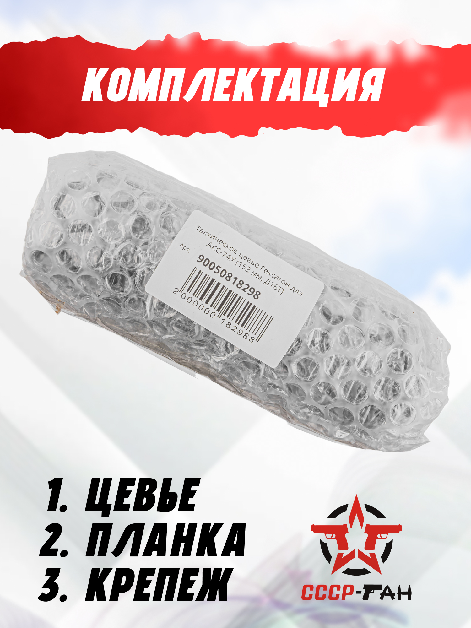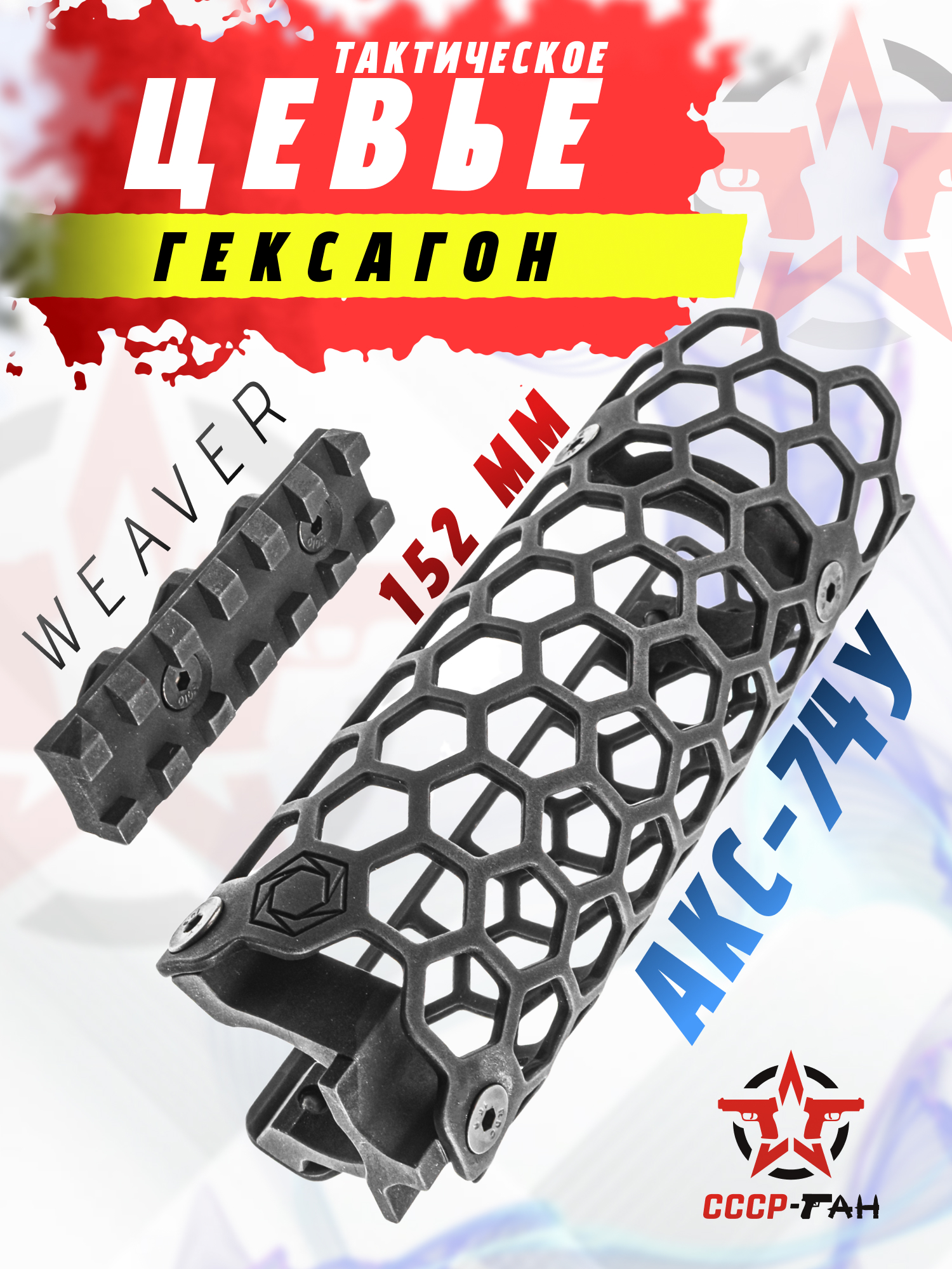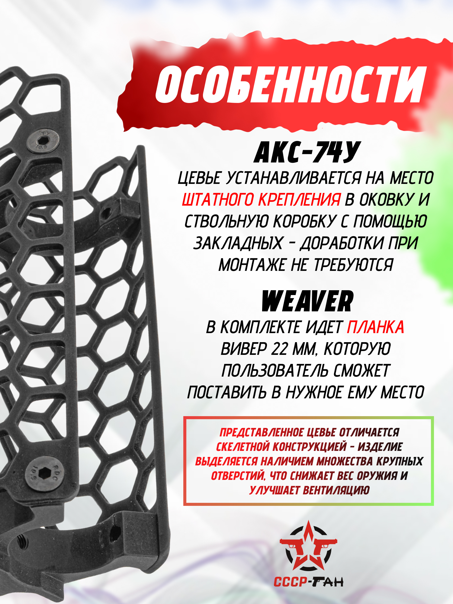 Представленная модель цевья изготовлена для автомата АКСУ 74 года разработки, а также его гражданской модификации Сайга-АКСУ - образец имеет длину 152 миллиметра, а посадочные размеры соответствуют штатным, ввиду чего доводка при монтаже не нужна. Геометрия изделия скелетная - по всей площади цевья отфрезеровали шестиугольные отверстия. Последнее улучшает охлаждение, что актуально для автомата с укороченным стволом.