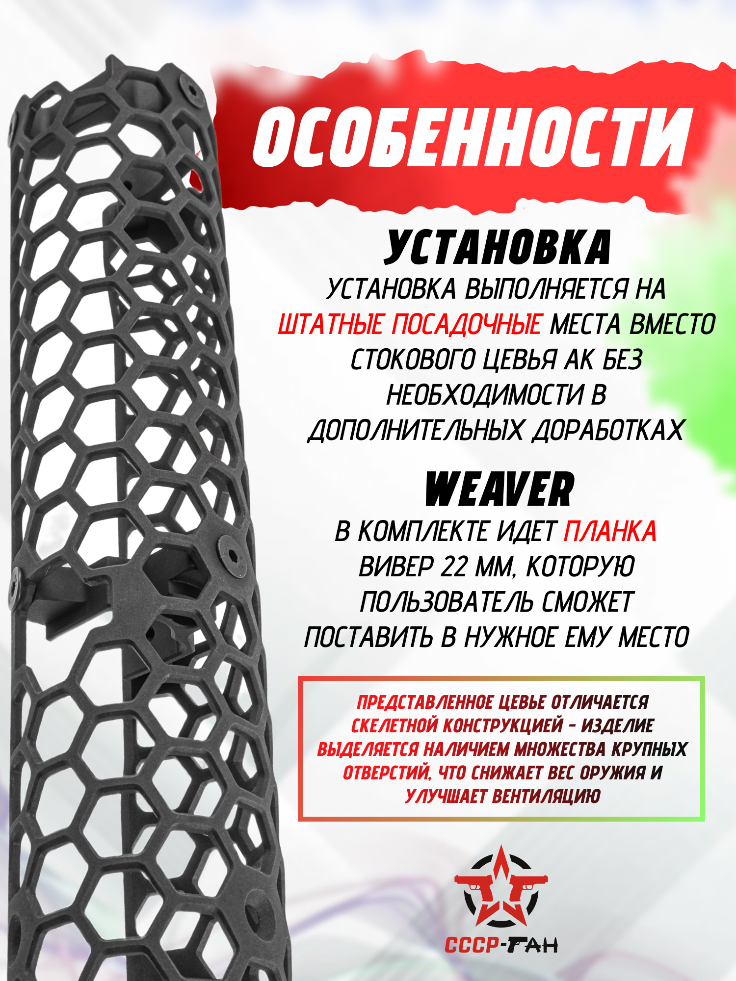 Вместе с этим указанные отверстия служат крепежными слотами под планки Вивера 22 мм - закрепив последние на цевье Geksagon пользователь сможет размещать на оружии дополнительные аксессуары. В комплекте одна планка - она предполагает наличие 6 слотов.