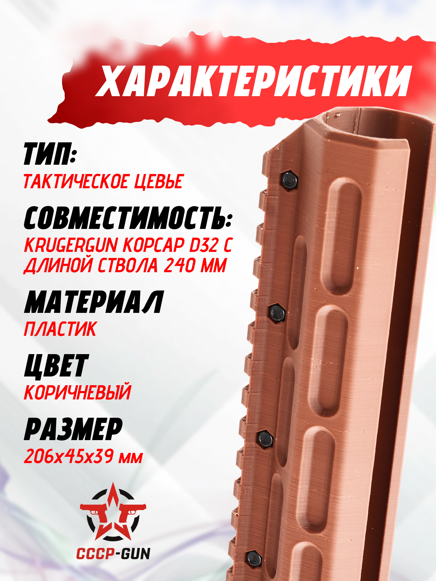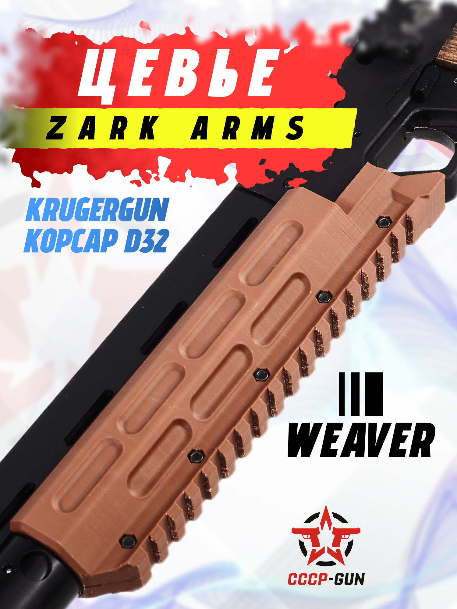 Zark цевье на KrugerGun Корсар D32 представляет собой тактический обвес с функцией расширения потенциала пневматического пистолета. Благодаря спроектированной планке типа Вивер, на оружие устанавливаются дополнительные модули, такие как рукояти и сошки. Также доступен монтаж устройств в виде фонарей или лазерных целеуказателей для комфорта прицеливания.