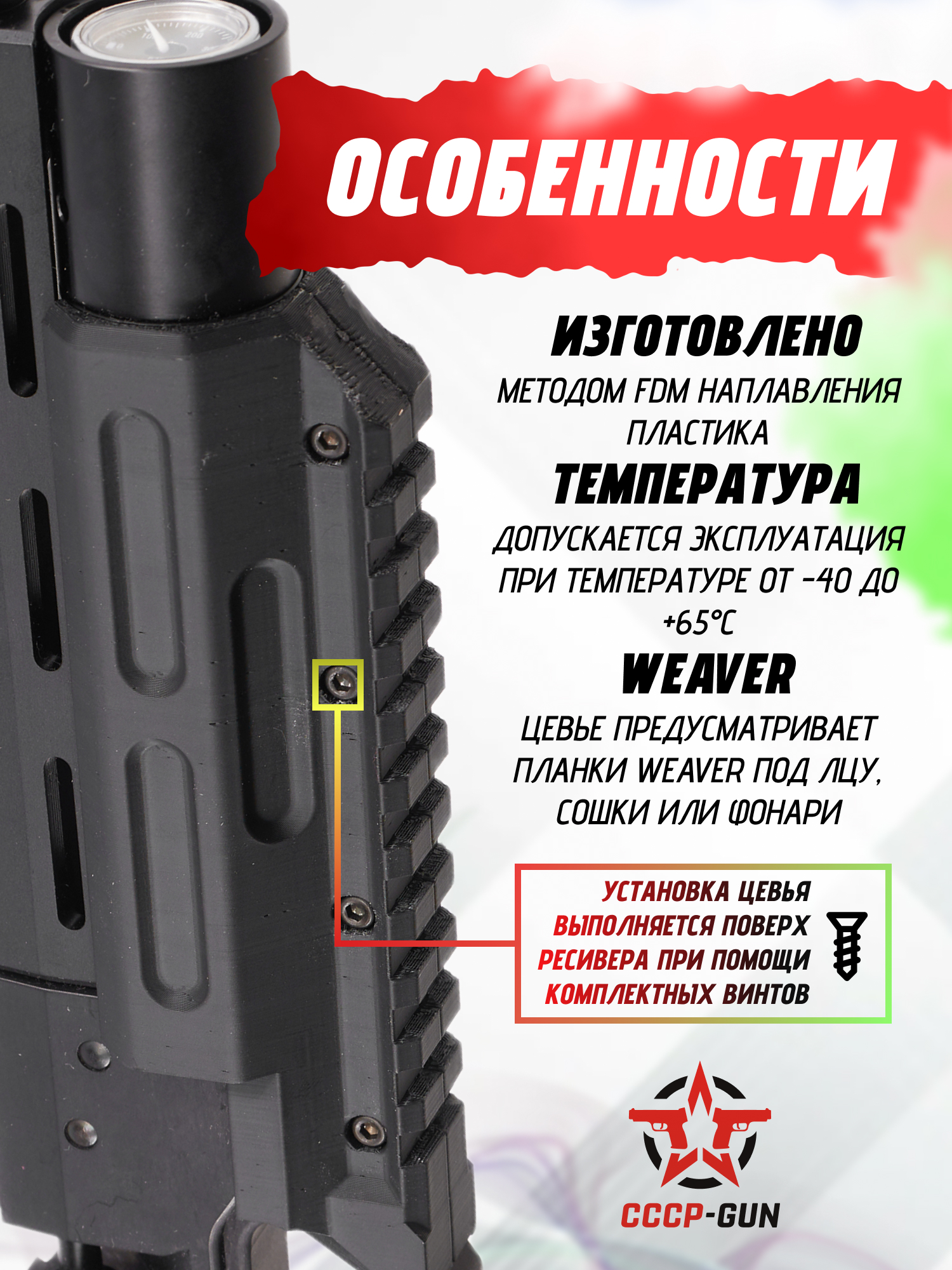 | Особенности конструкции | Планка Weaver 22 мм, 3D печать методом FDM наплавления, эксплуатационная температура: от -40 до + 65°C |