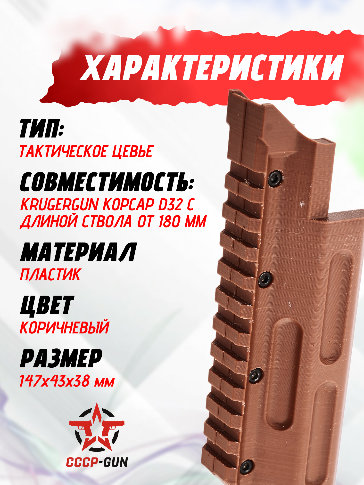 Обозреваемое изделие создано, чтобы модифицировать пневматический пистолет Корсар D32 от бренда KrugerGun с длиной ствола в 180 миллиметров. Такой обвес выполняет роль комфортной платформы, которая помимо улучшения хвата за счет продуманной конструкции дает дополнительно устанавливать элементы тюнинга с помощью интегрированной планки Пикатини. Эта направляющая помогает фиксировать на пневматике упоры, рукояти и осветительные устройства.