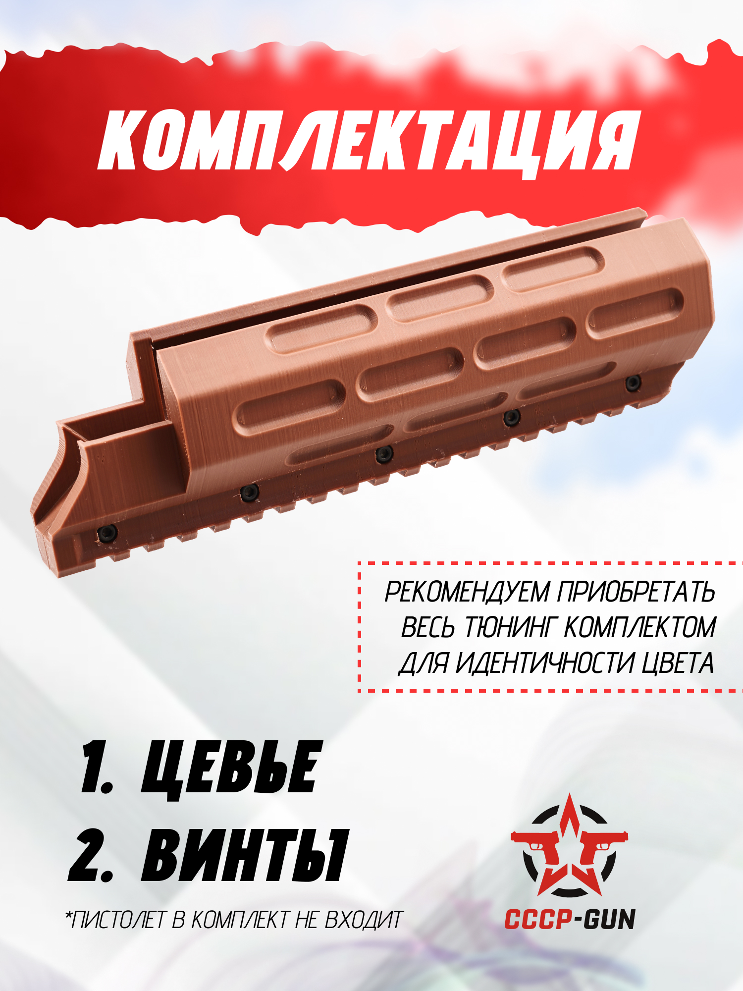 Установка цевья из двух половин на пистолет Крюгерган Корсар Ф42 240 мм осуществляется при помощи пяти винтов под гайки, которыми комплектуется набор. Закручивая резьбу, пользователю не стоит применять чрезмерную силу, чтобы зафиксировать части тюнинга без повреждения пластикового слоя. Обвес плотно прилегает к трубчатому баллону, так как детали проходят обязательную заводскую обработку, но изготовитель все же оставляет малый шанс наличия остаточных дефектов, которые свойственны ФДМ печати и не влияют на функционал.