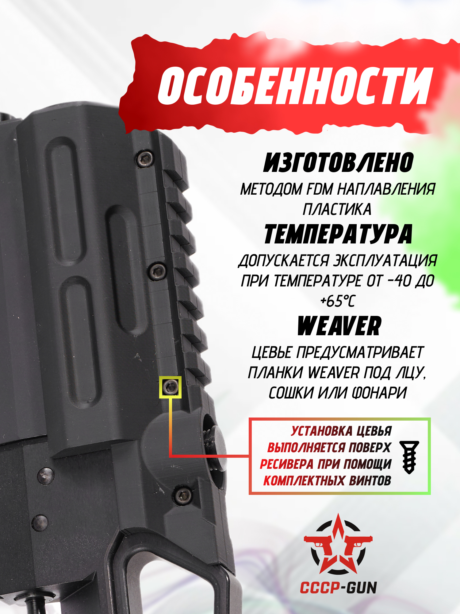 | Особенности конструкции | Планка Weaver 22 мм, 3D печать методом FDM наплавления, эксплуатационная температура: от -40 до + 65°C |
