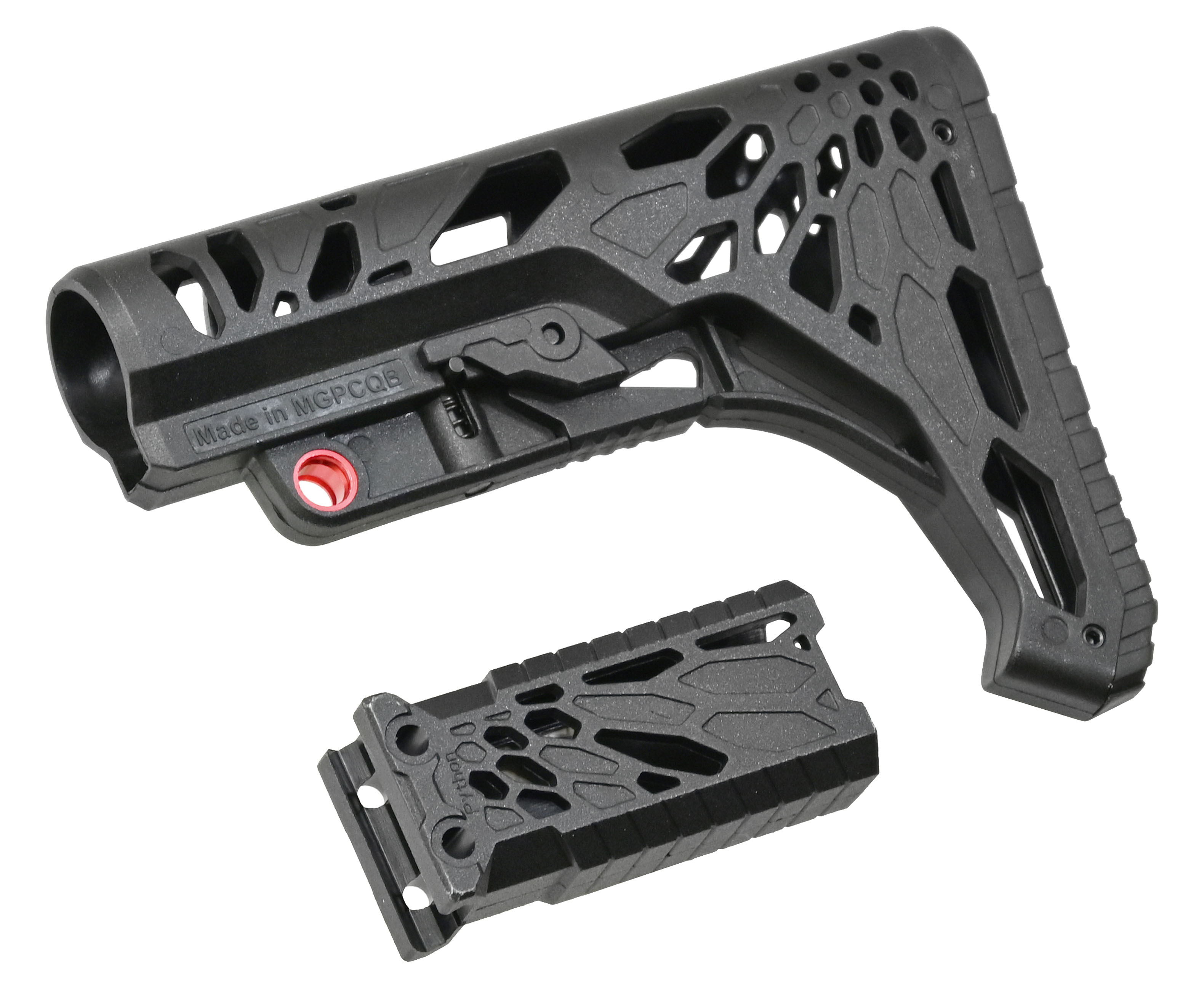 Изделия выполнены из крепкого полимерного материала, рукоять имеет текстурированную поверхность для надежного хвата даже в условиях повышенной влажности или при использовании стрелковых перчаток. Общая масса обвесов не превышает 0.25 кг, они не навредят балансировке винтовки.