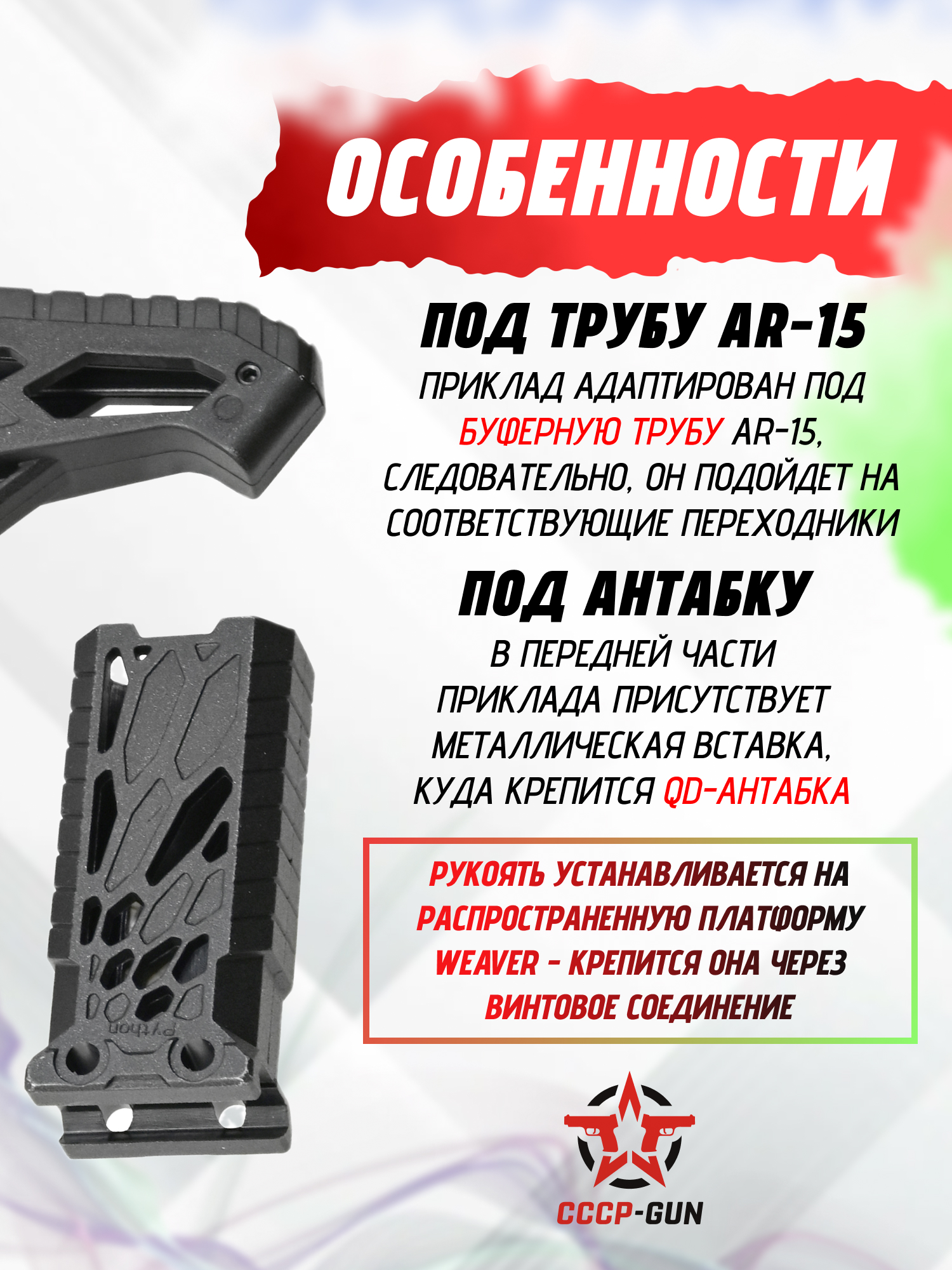 Приклад AR 15 Патриот оснащен пазом под QD-антабку и прорезью для ремня, что расширяет возможности организации подвеса оружия. В комплект включена эргономичная тактическая рукоять, совместимая с планками Weaver 22 мм.