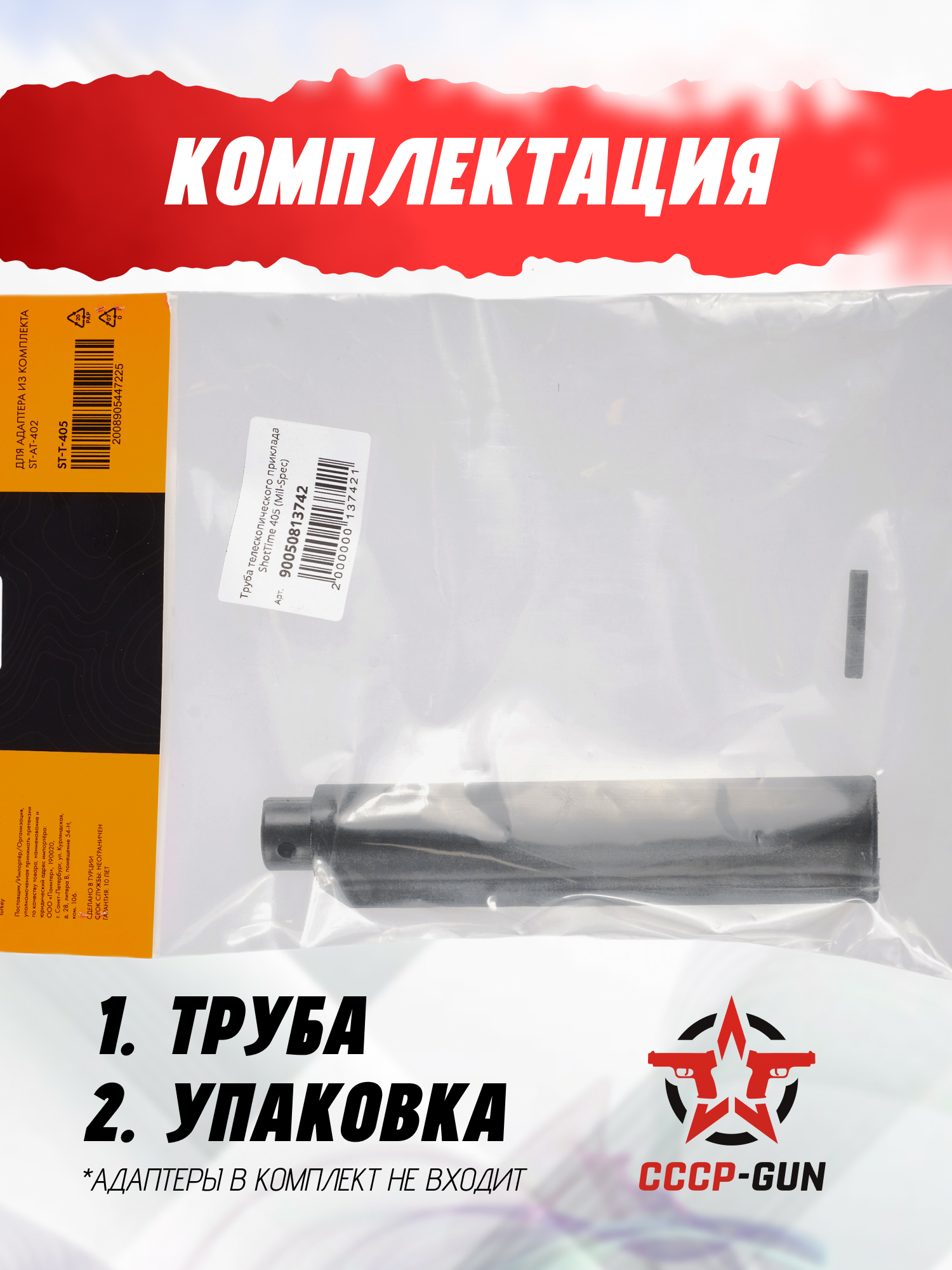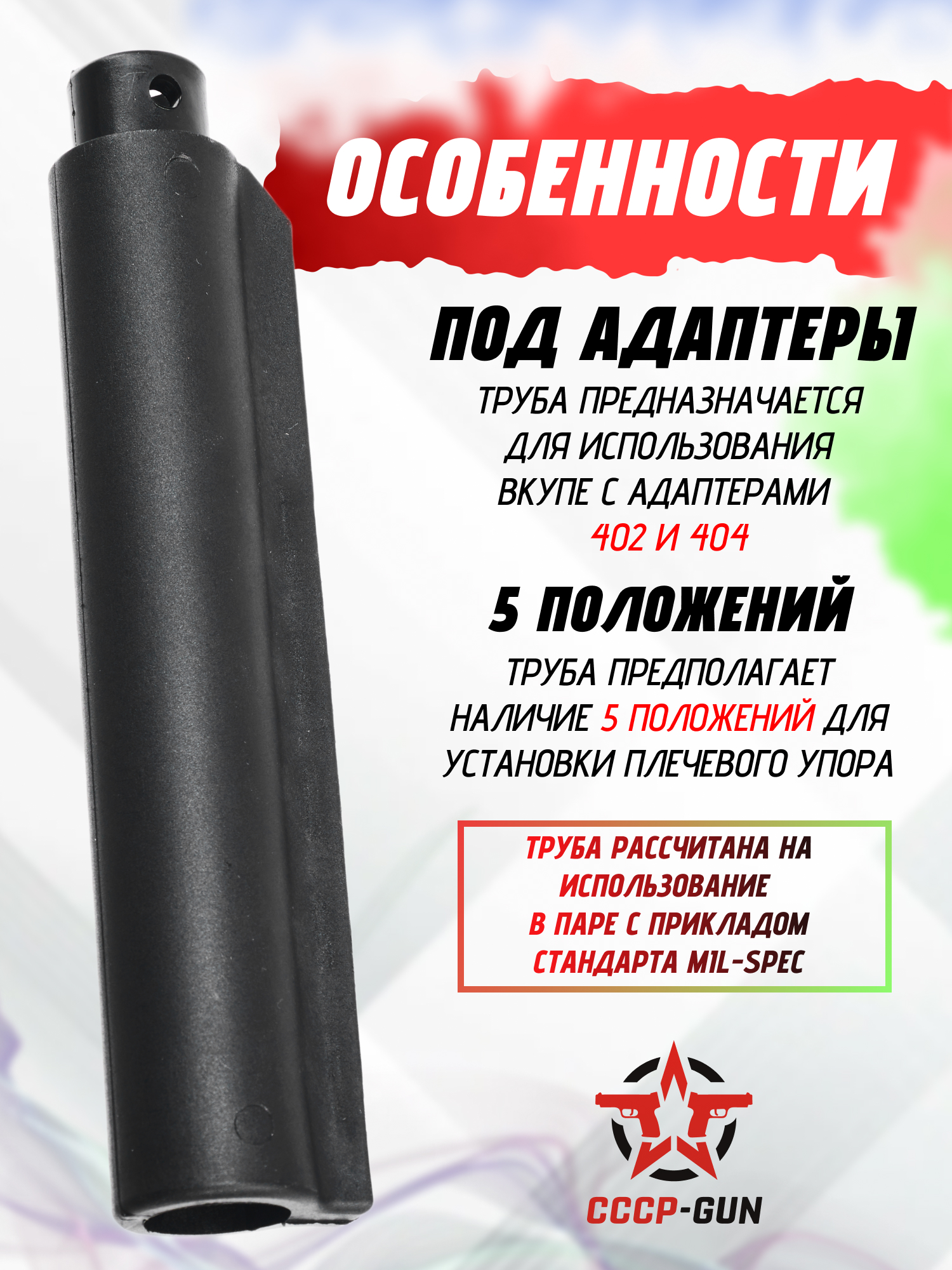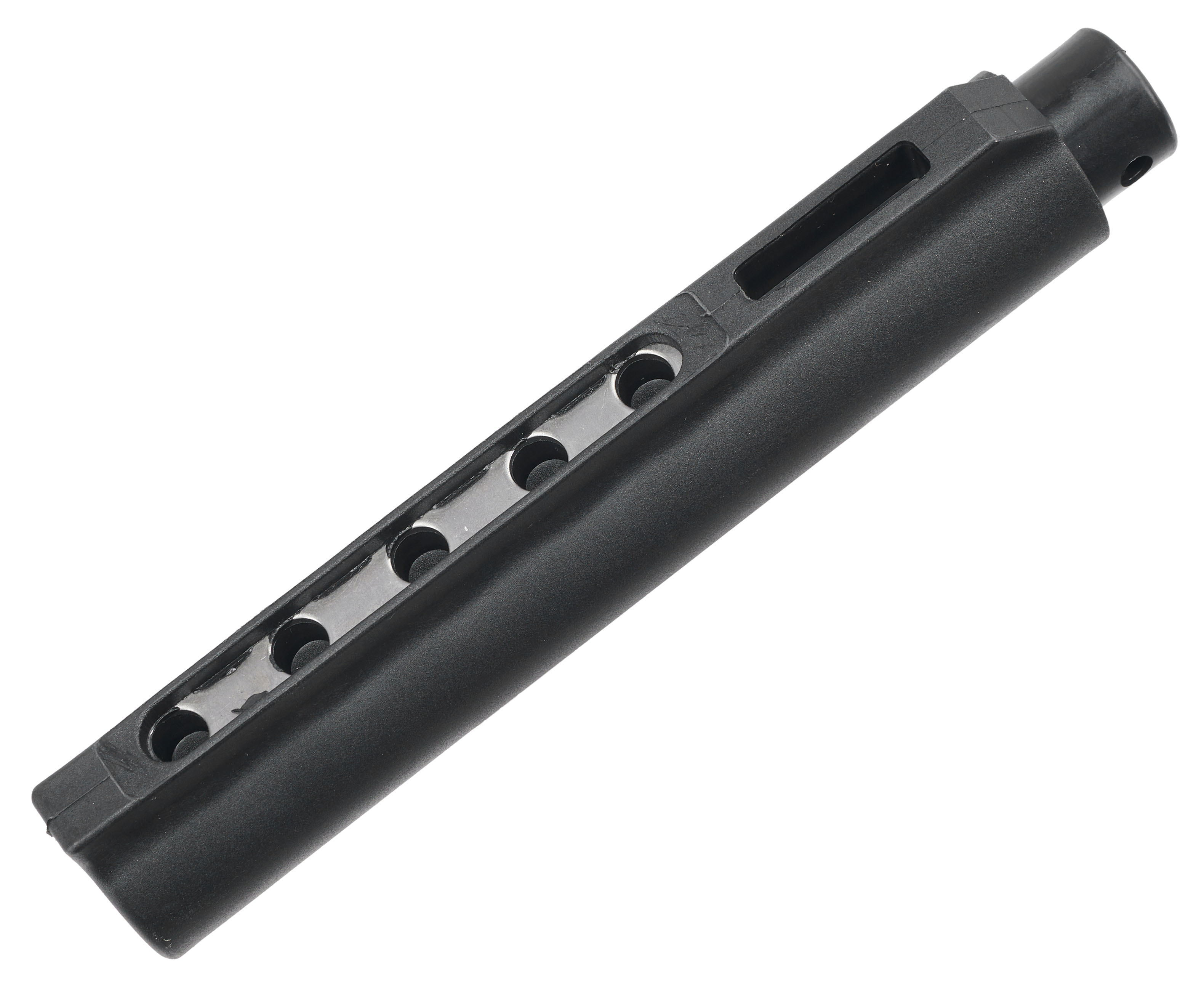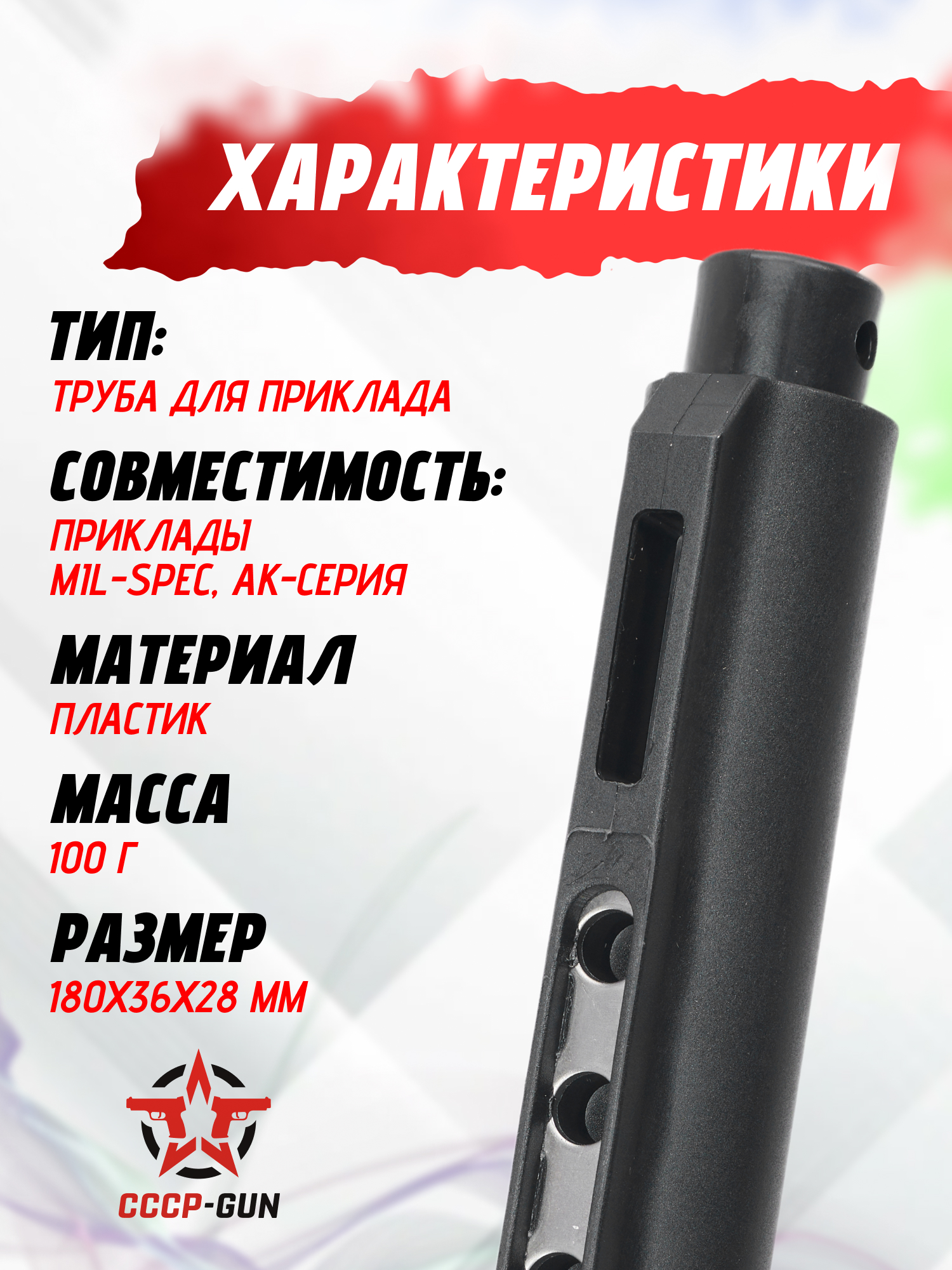 Модель выполнена из крепкого полимера, который выдерживает нагрузки при стрельбе. Помимо прочего, материал положительно повлиял на массу экземпляра. Его вес не превышает 0.1 кг, эта труба приклада не окажет серьезного влияния на развесовку винтовки, карабина или автомата.