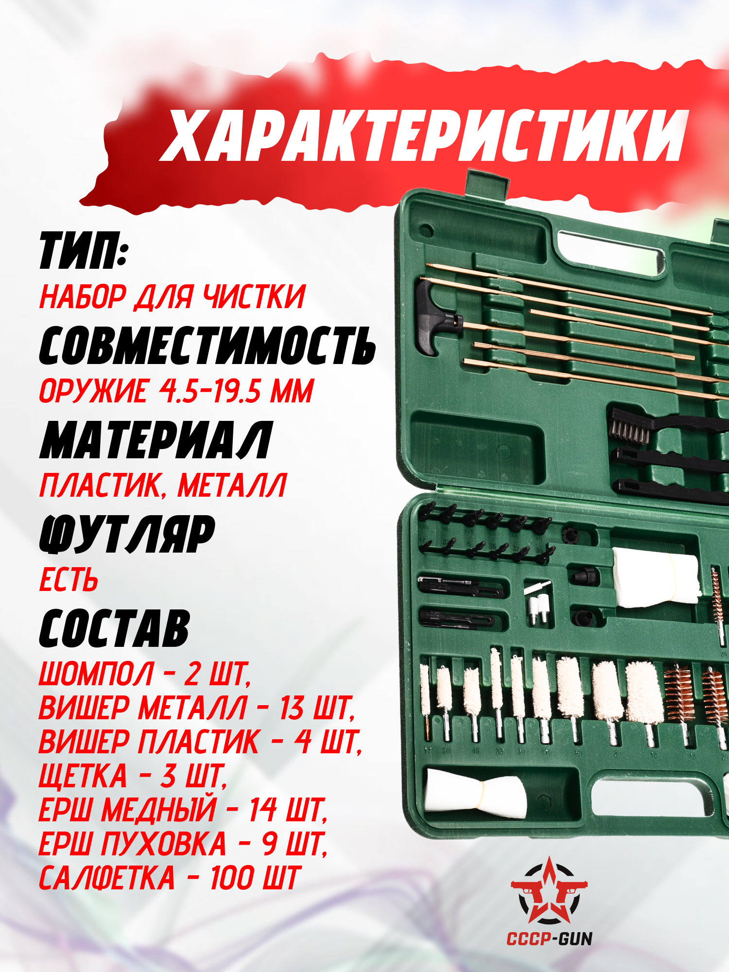 В комплект набора для чистки входят различные виды шомполов, щетки, и другие необходимые для чистки и обслуживания оружия аксессуары.