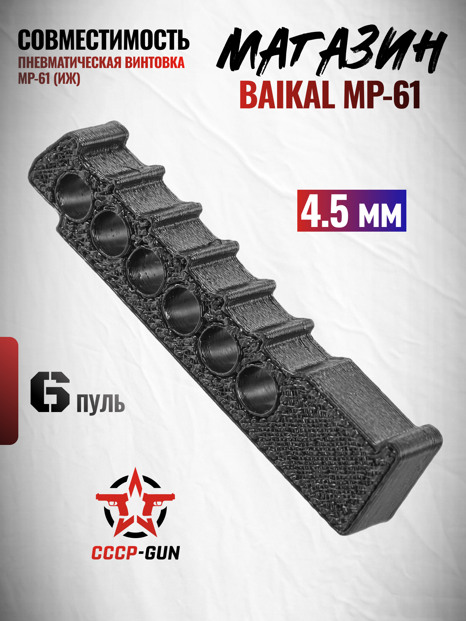 Обозреваемая модель магазина предназначается для применения с пневматическими винтовками Baikal линейки МР-61. Образец предполагает эксплуатацию с пулями из свинца калибра 4.5 миллиметра воланчикового типа. Заполненная обойма вставляется в соответствующий приемный отсек на ствольной коробке оружия до характерного щелчка, свидетельствующего о полной фиксации.