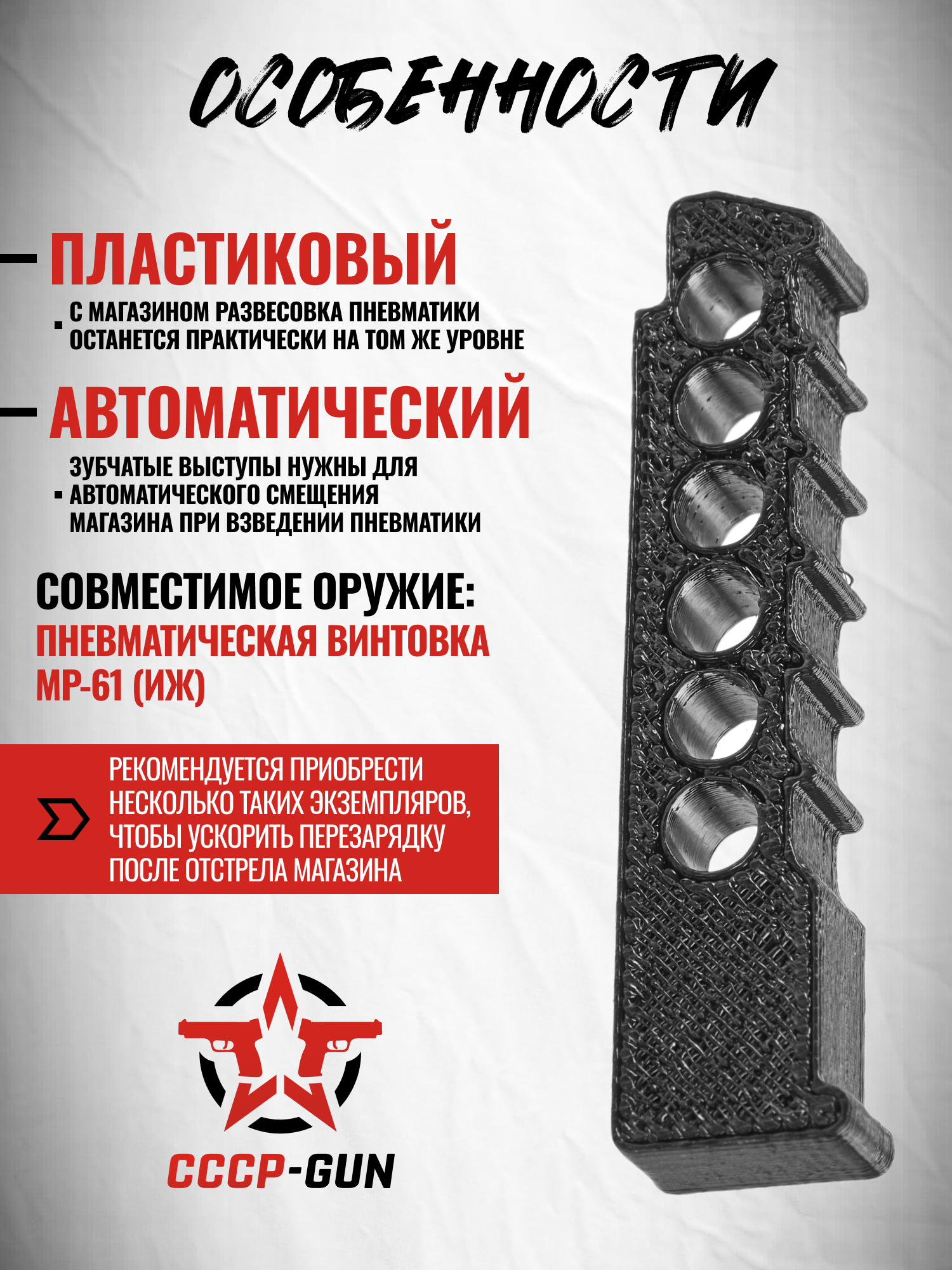 Экземпляр предусматривает 6 ячеек под снаряды. В ходе взведения оружия посредством отвода бокового рычага магазин ИЖ-61 совершает движение, которое обеспечивается за счет взаимодействия зубчатых насечек на его корпусе с механизмом подачи - таким образом, каждый последующий боеприпас автоматически занимает положение для производства выстрела. Материалом для изготовления обоймы выступил полимер.