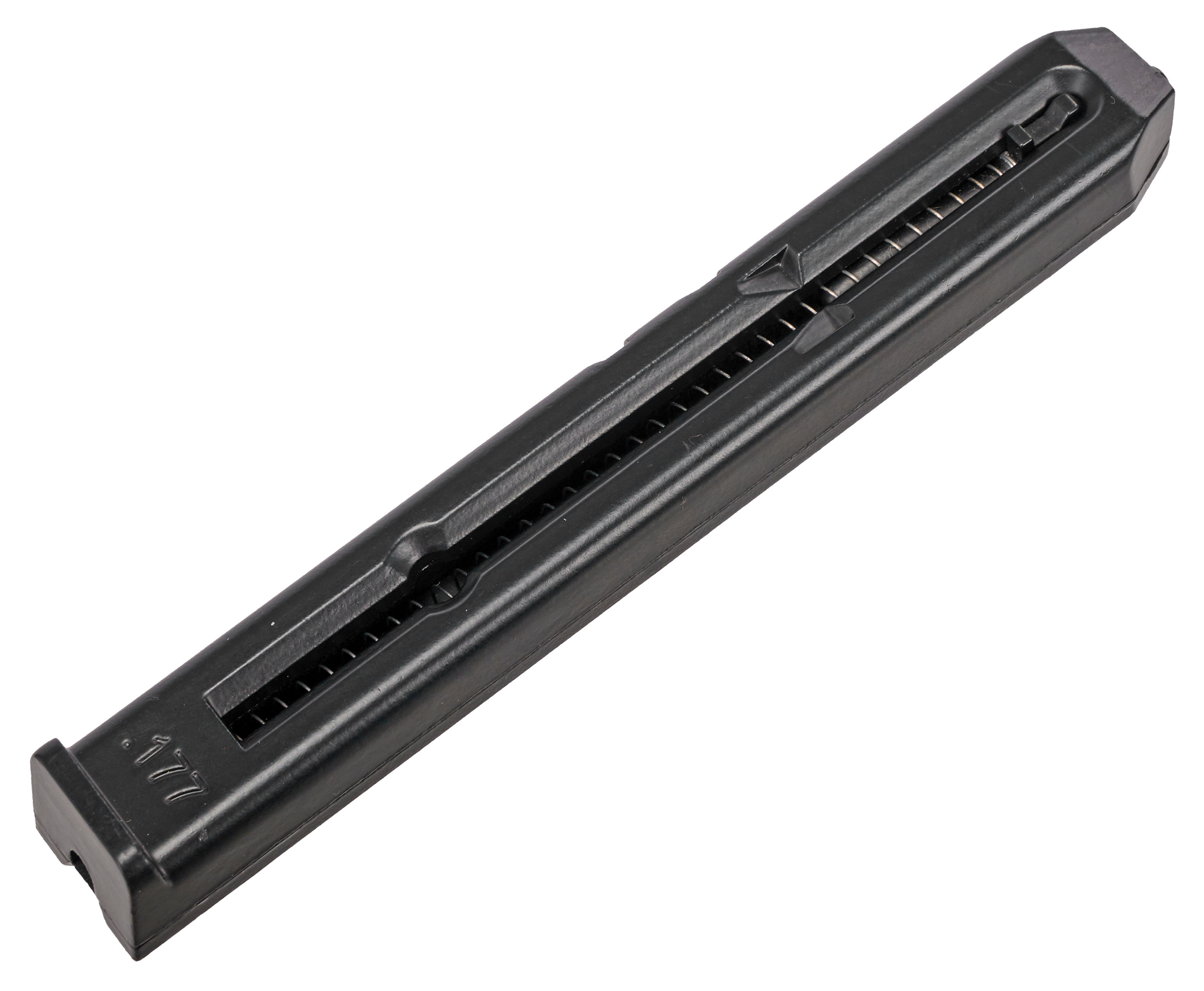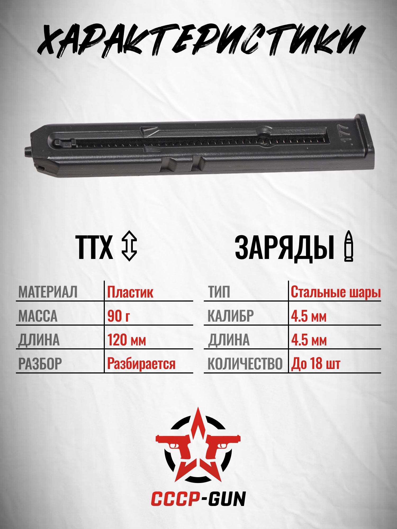 Обозреваемый магазин вмещает 18 шариков, позволяя совершать длинные серии выстрелов. Подачу снарядов выполняет предусмотренная конструкцией пружина, она толкает бегунок. Использование этой модели гарантирует бесперебойную работу пистолета и помогает сосредоточиться на занятиях - владелец может взять на стрельбище несколько заряженных экземпляров.