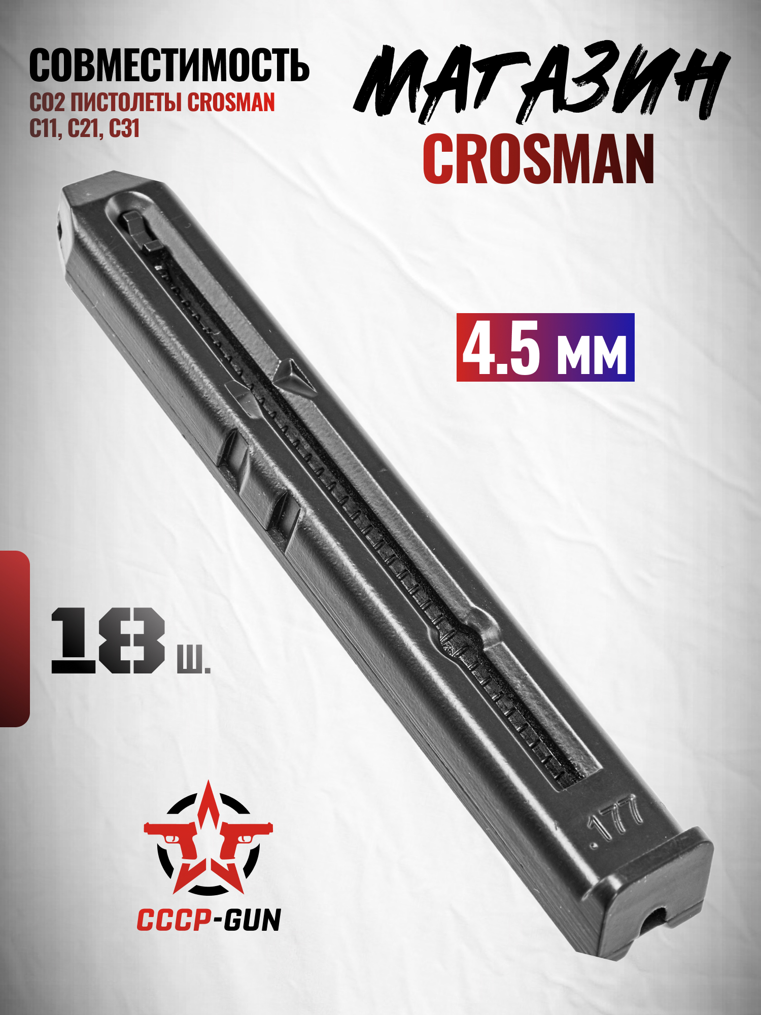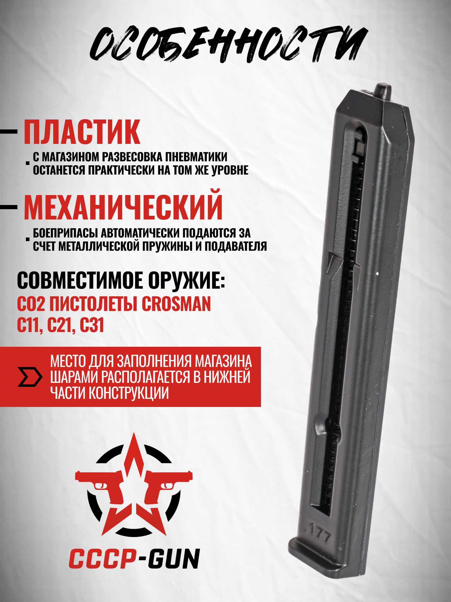 Кросман магазин в полной мере совместим с газобаллонными моделями линеек C11, C21 и C31, и заряжается шариками из стали диаметра 4.5 мм. Он вставляется в рукоять привычным способом и надежно фиксируется.