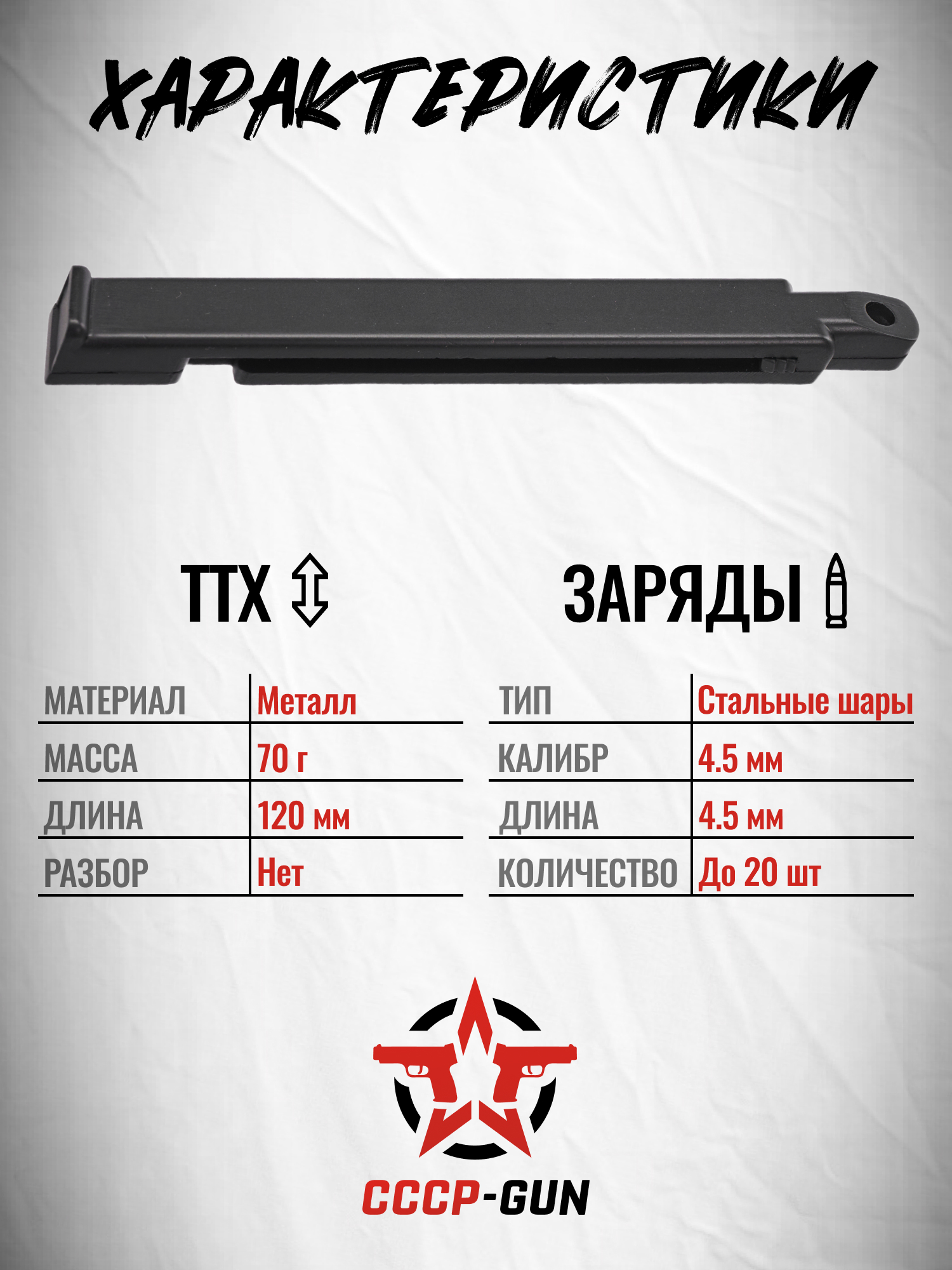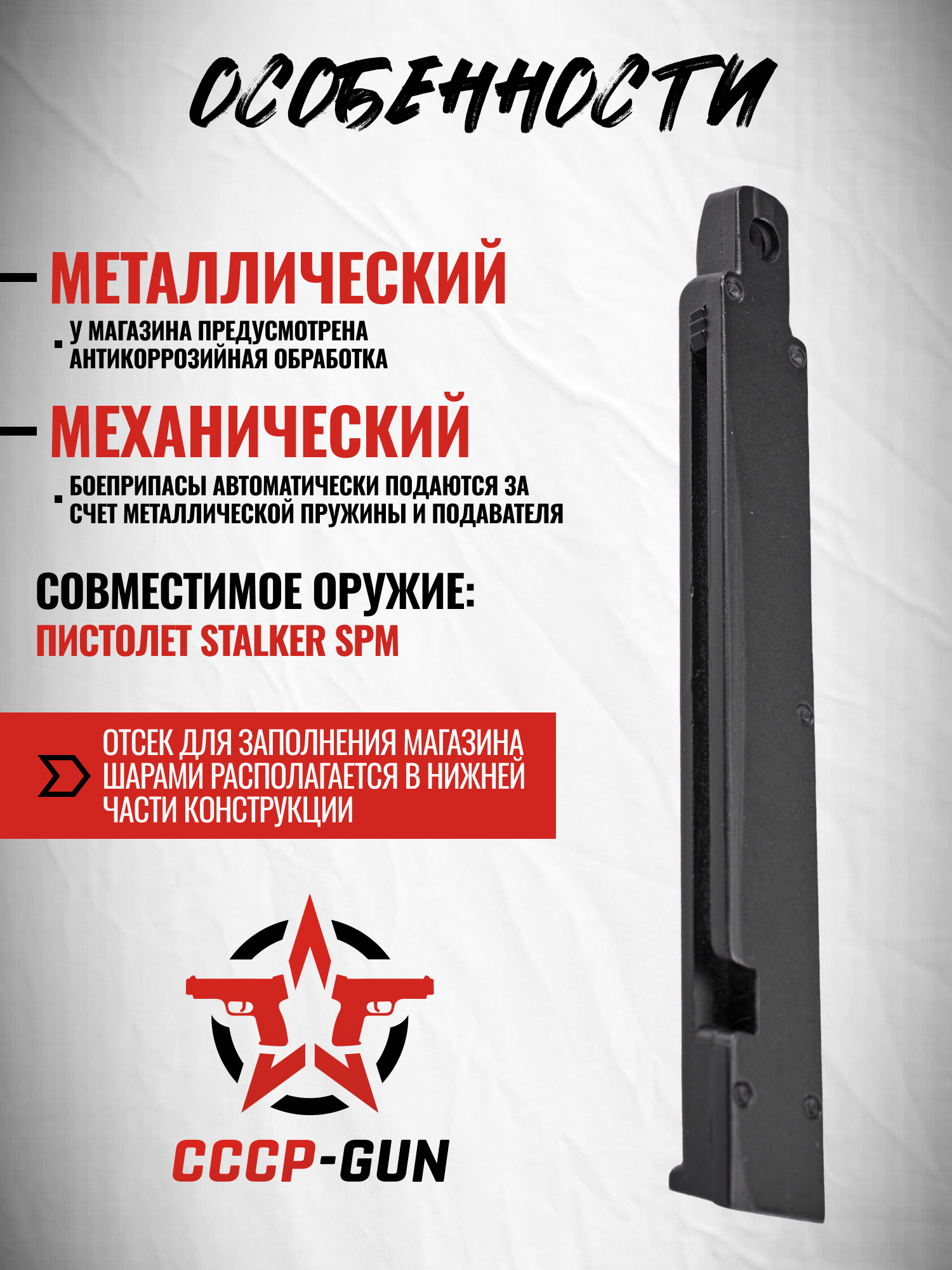 Обозреваемый экземпляр предназначен для применения с пневматической моделью Stalker SPM, вдохновленной пистолетом Макарова. Он задвигается в рукоять с передней ее части и обеспечивает бесперебойную подачу снарядов калибра 4.5 мм. Изделие будет полезно для пользователей, предпочитающих продолжительные тренировки или развлекательную стрельбу, в которой необходима ускоренная смена боекомплекта.