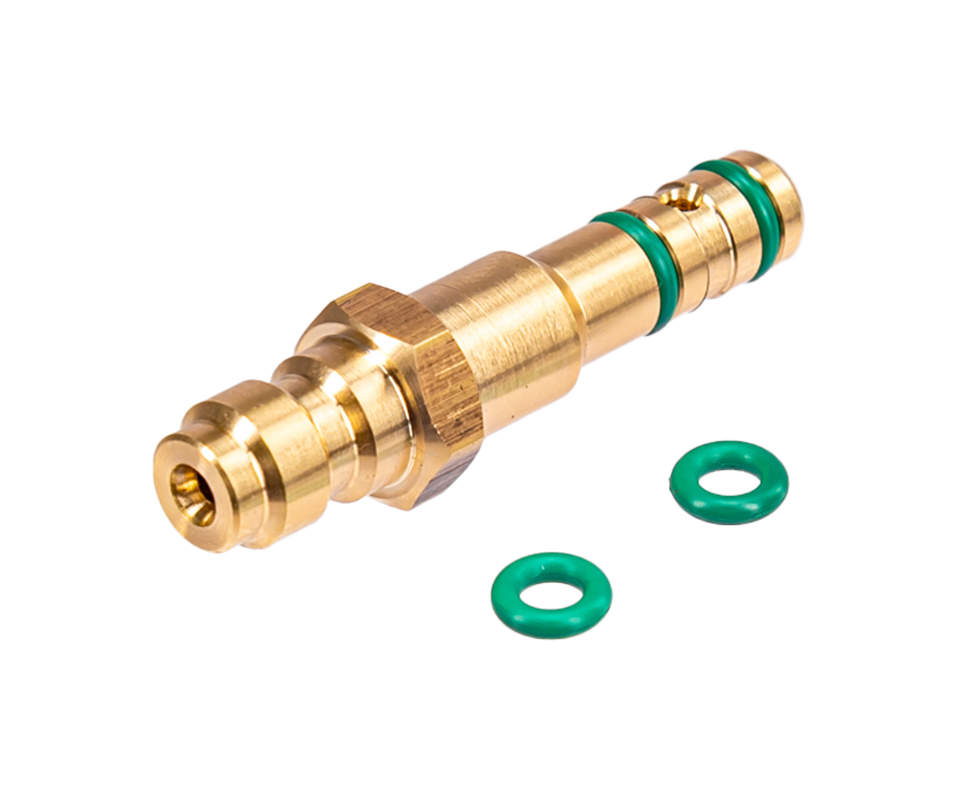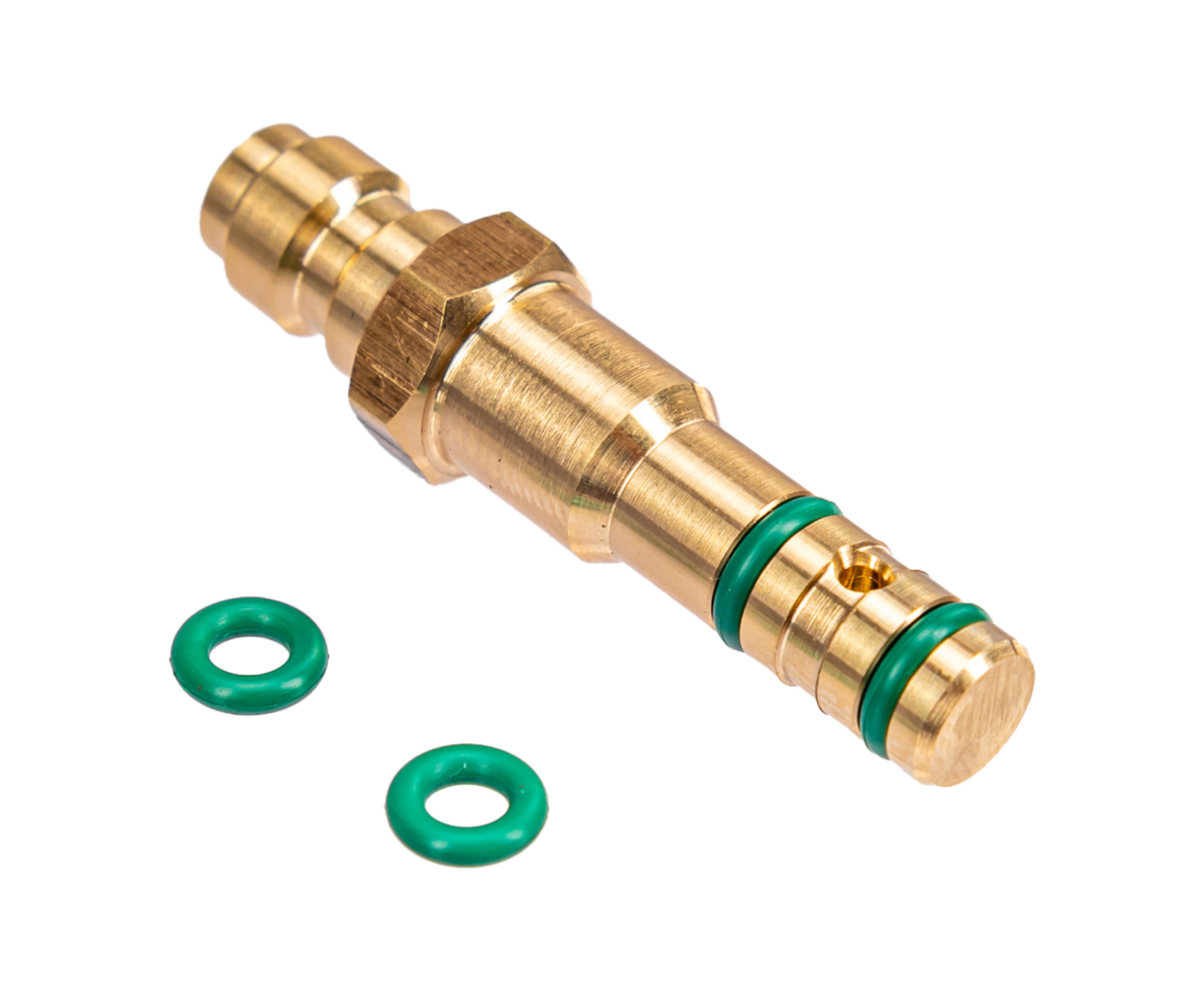 Штуцер выполняют из латуни, что обуславливается прочностью металла и одновременно мягкостью и легкостью - это понизило шанс повреждения порта при некорректной установке. Также для обозреваемого сырья является характерным наличие стойкости к влажности с вытекающим из этого развитием коррозии. На конце разъема присутствуют уплотнители, а в комплекте нашлось место для пары запасных колец.