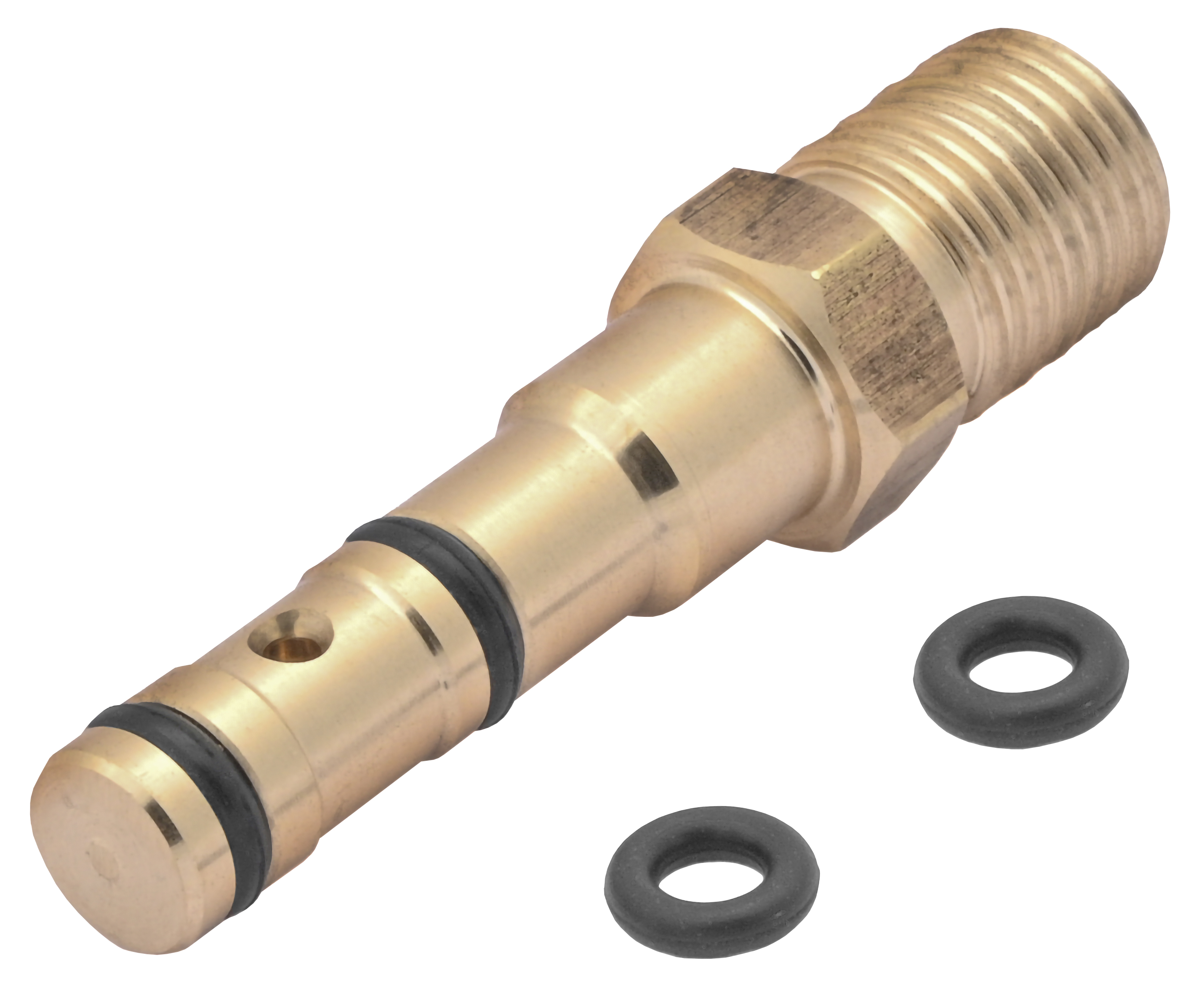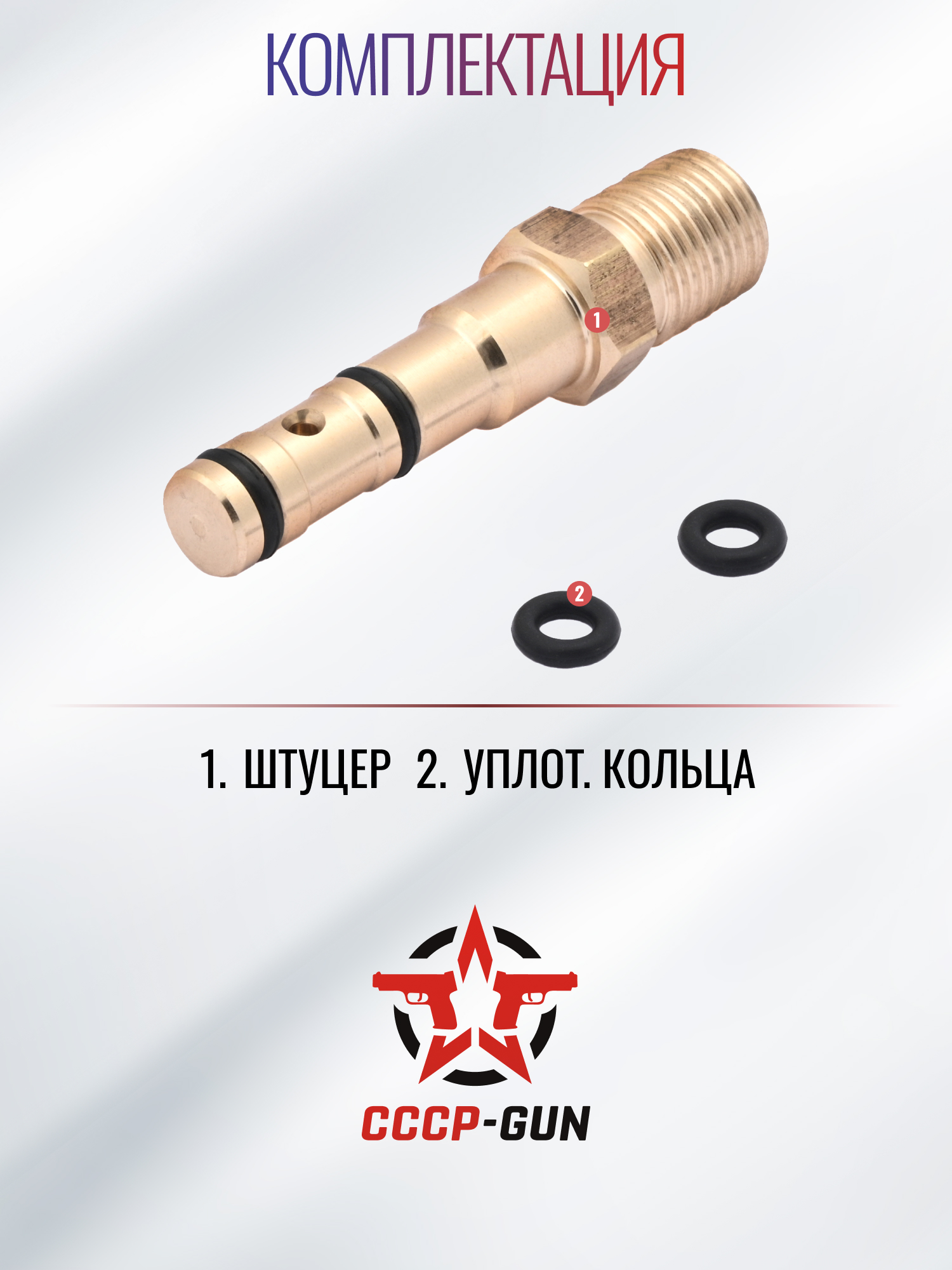 Обозреваемое исполнение выполнили с резьбой - подключение к оборудованию проводится посредством стандарта G1/8. Изделие получают посредством токарной обработки латунного прутка. Выбор материала определяет устойчивость к развитию коррозии. Вес представленной детали равен 10 граммам, соответственно наличие штуцера не утяжеляет комплект снаряжения стрелка.