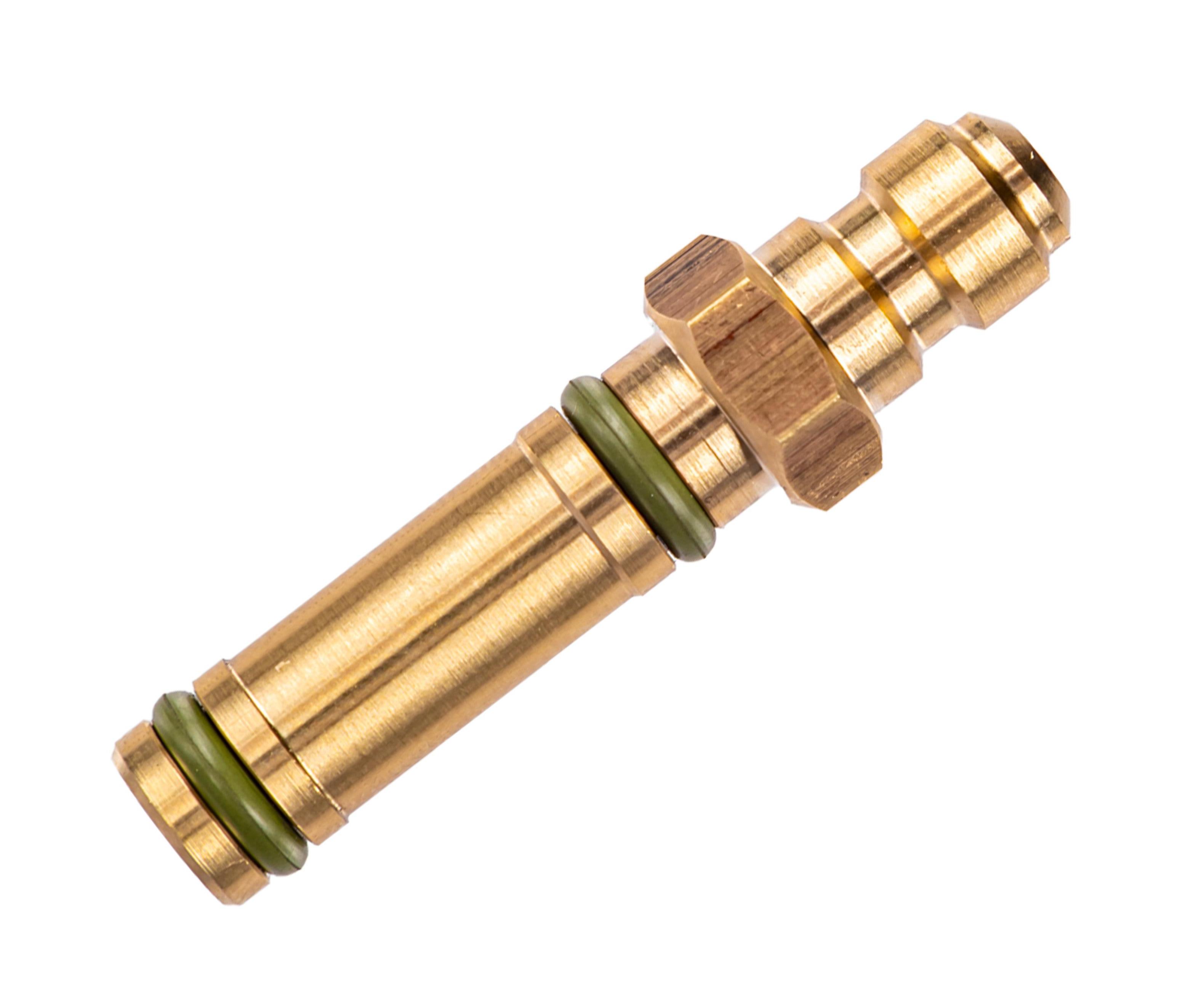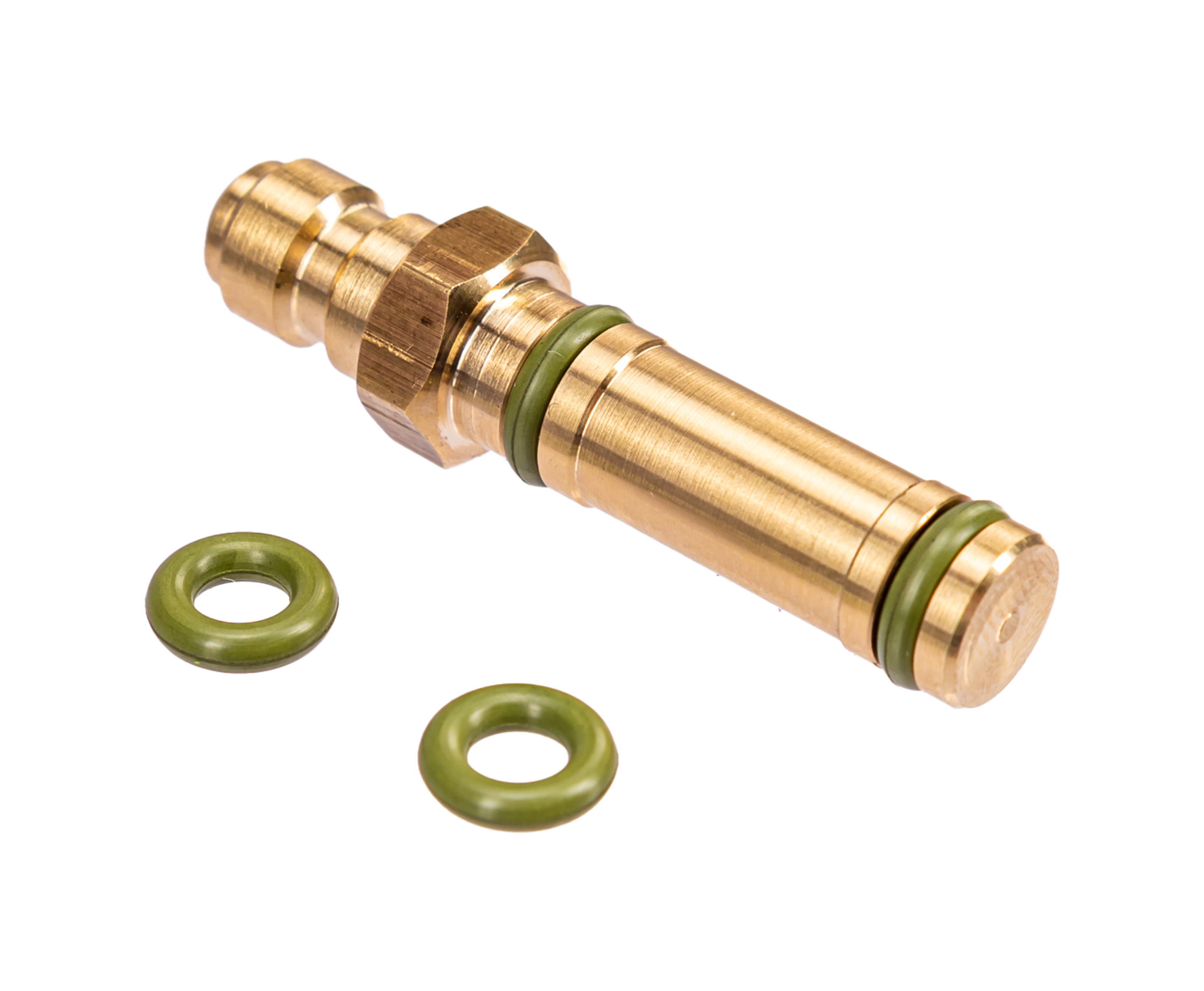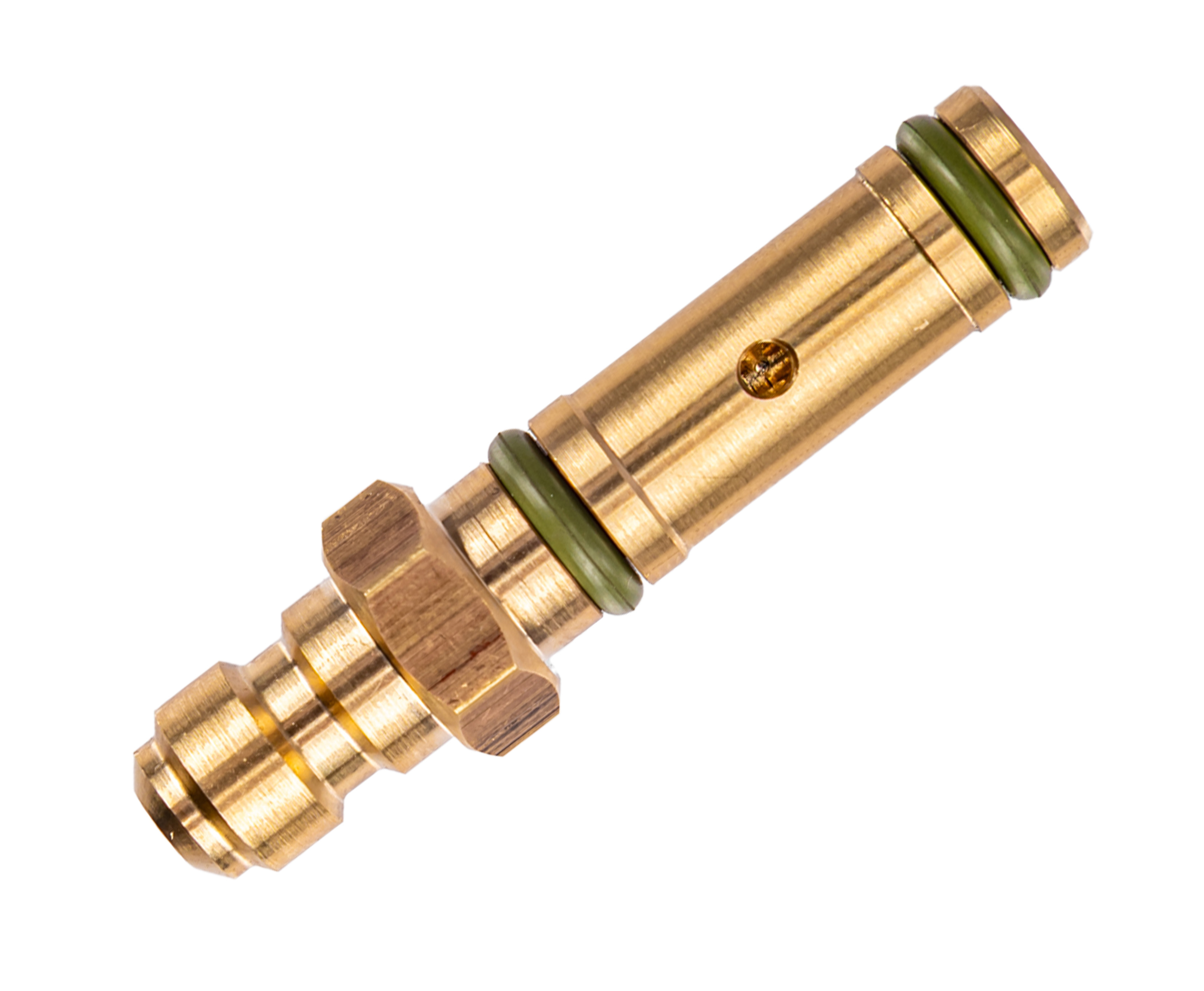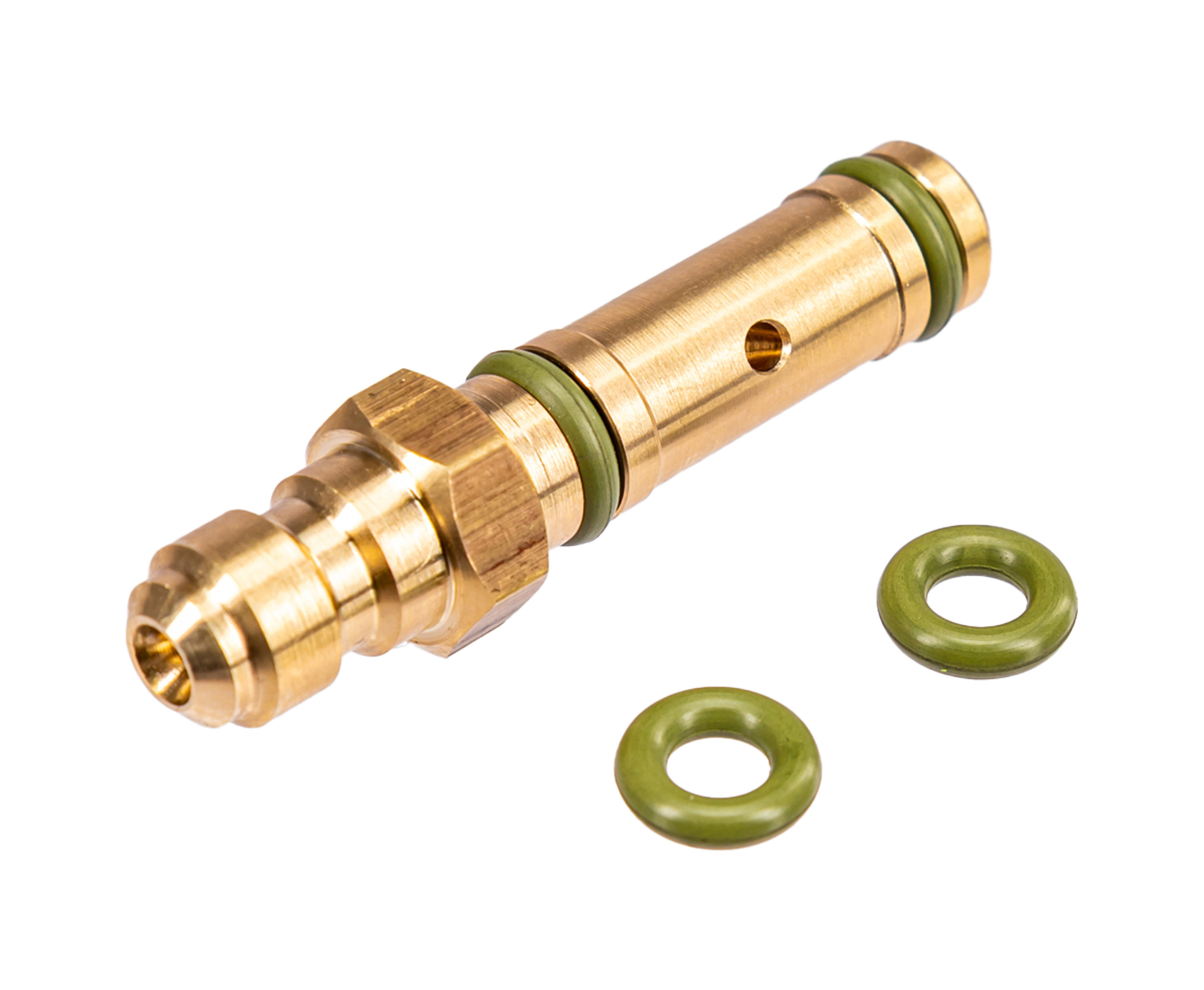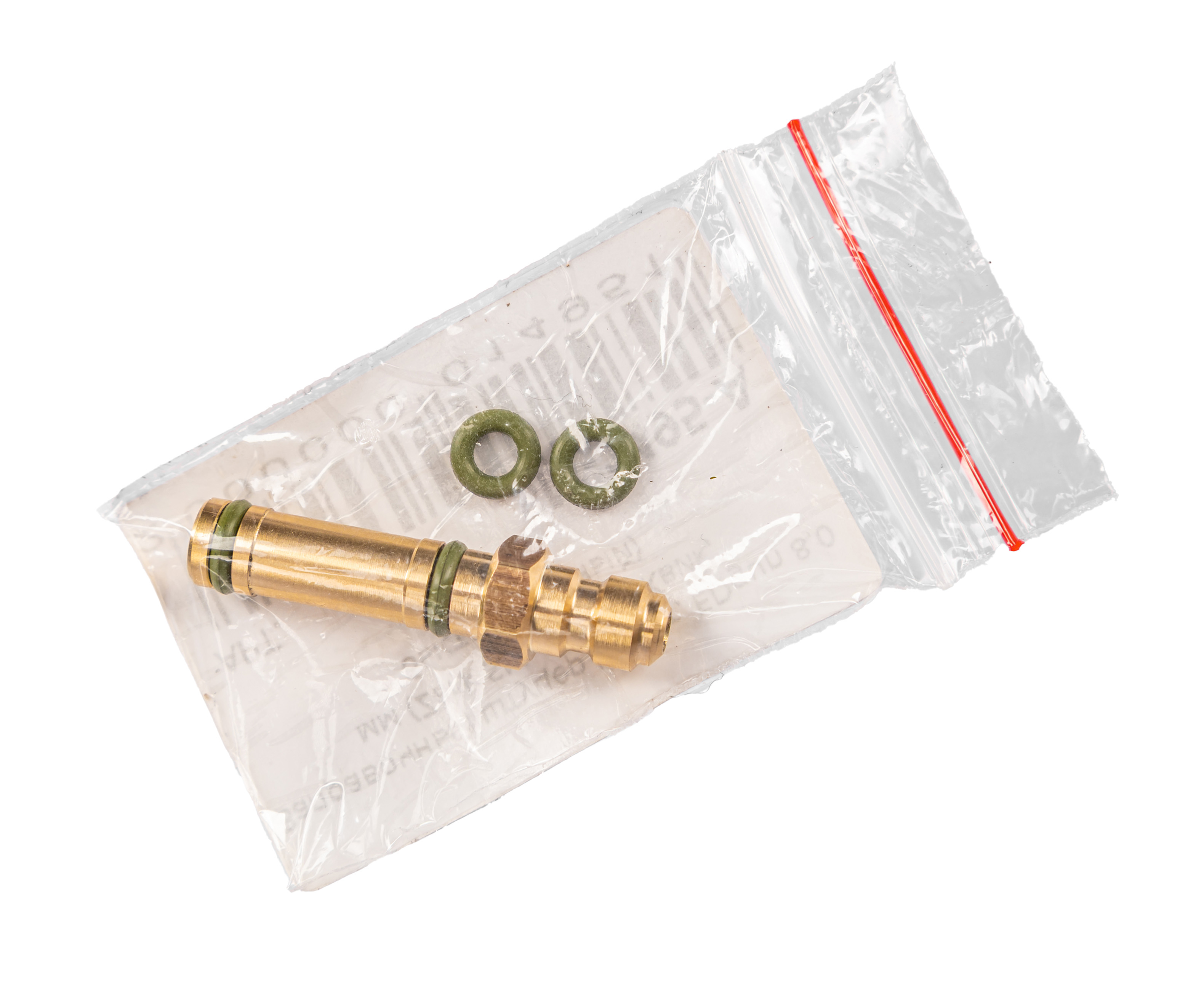 Заправочный штуцер Егерь изготовили из металлического сплава - используемый материал демонстрирует необходимую механическую прочность образца. Для предотвращения утечек рабочей среды в процессе нагнетания в конструкции реализовали герметизирующие кольца из резины.
