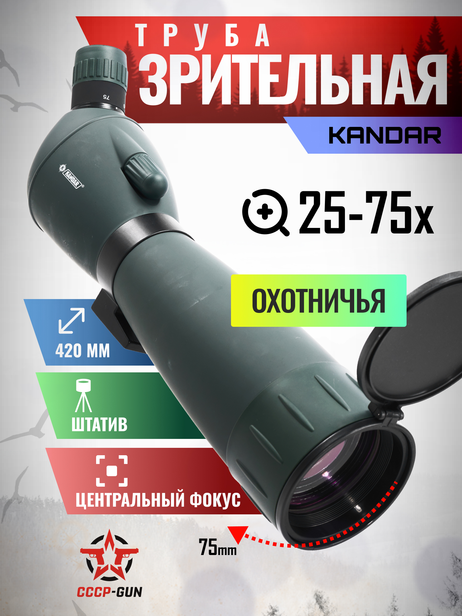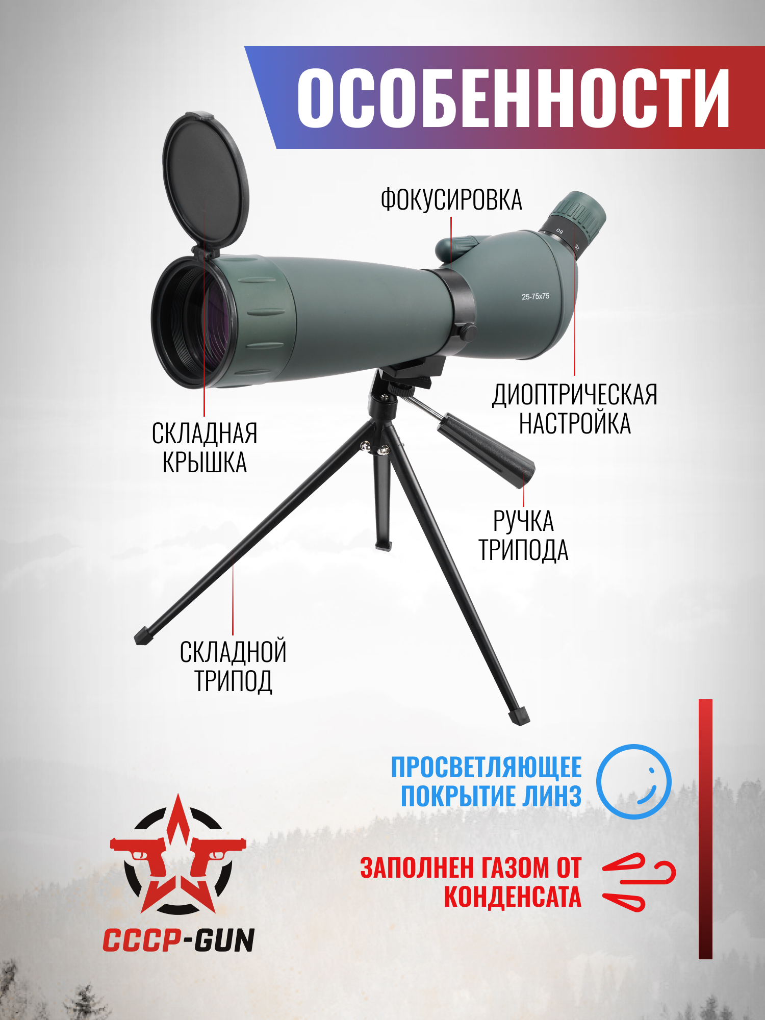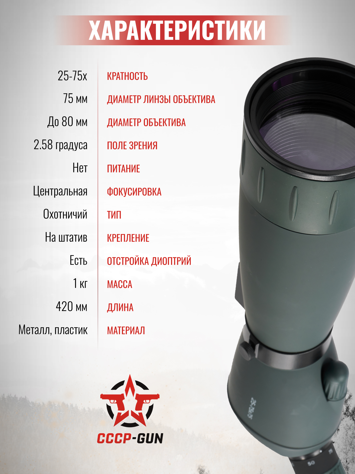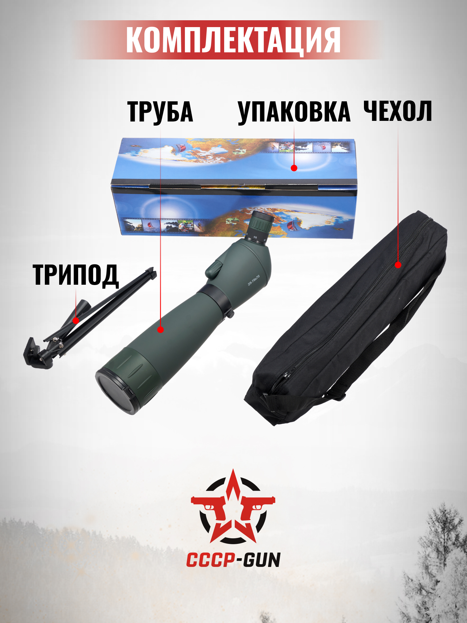 | Комплектация | Зрительная труба, кейс, чехол, штатив, корпусной, защита окуляра и объектива, инструкция, упаковка |